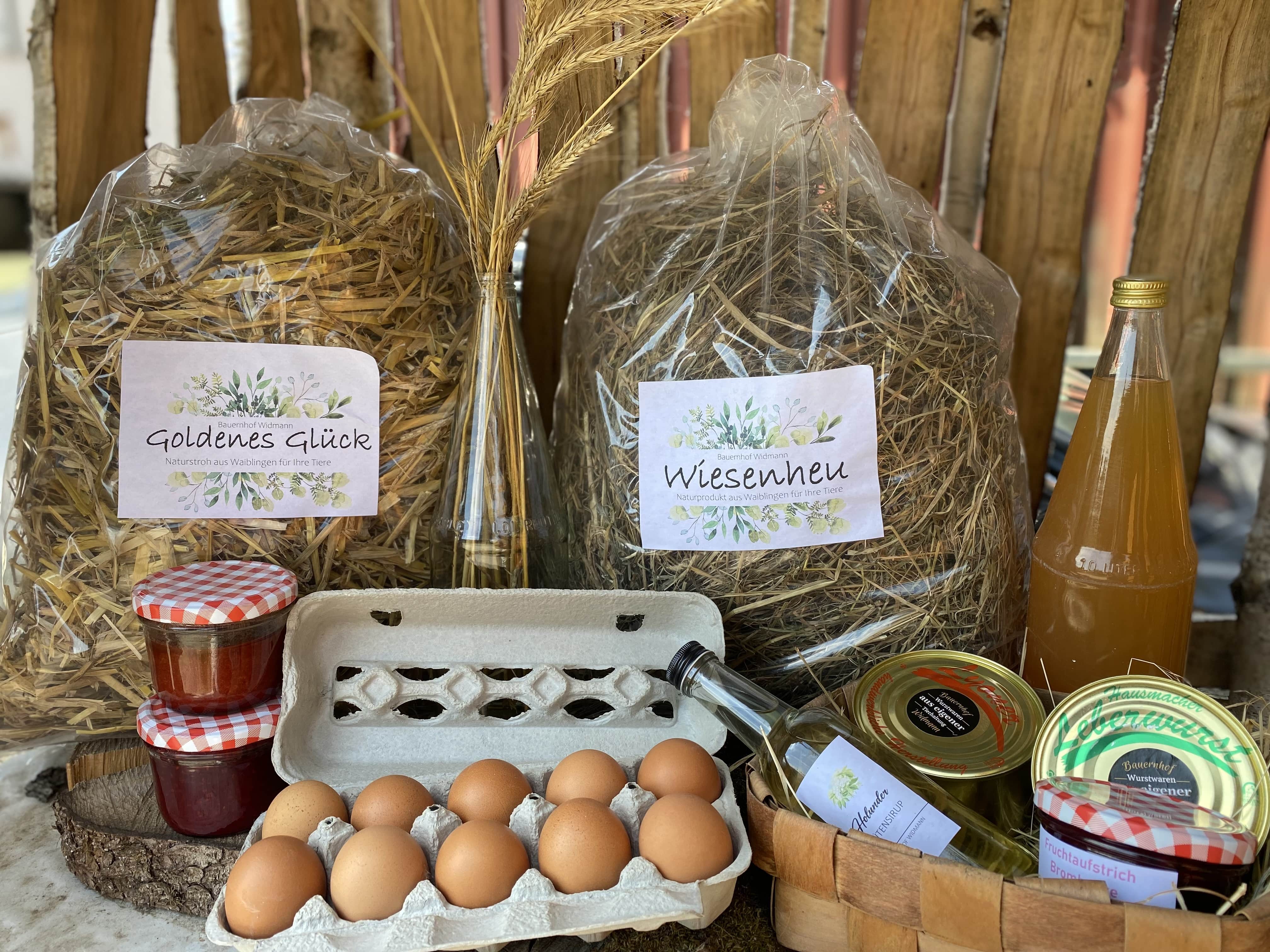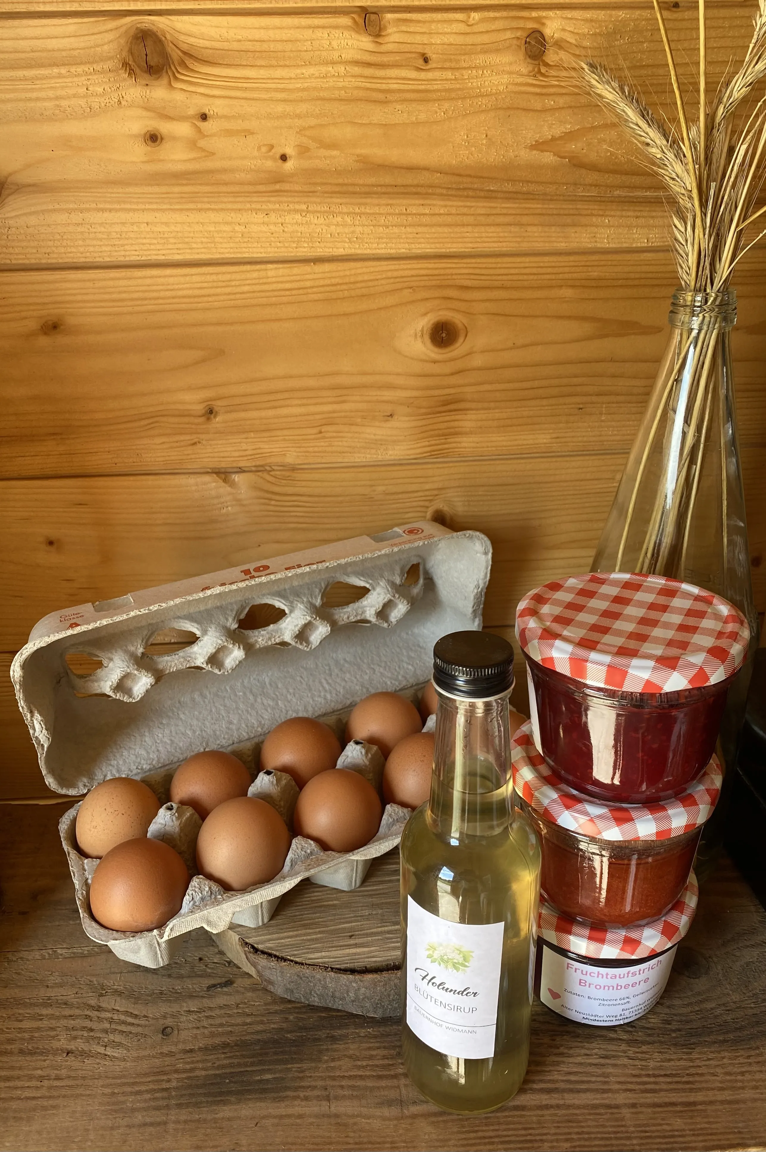 In unserem SB-Hofladen finden Sie eine vielfältige Auswahl an hausgemachten Produkten und frischen Eiern von unseren Freilandhühnern – direkt vom Hof,